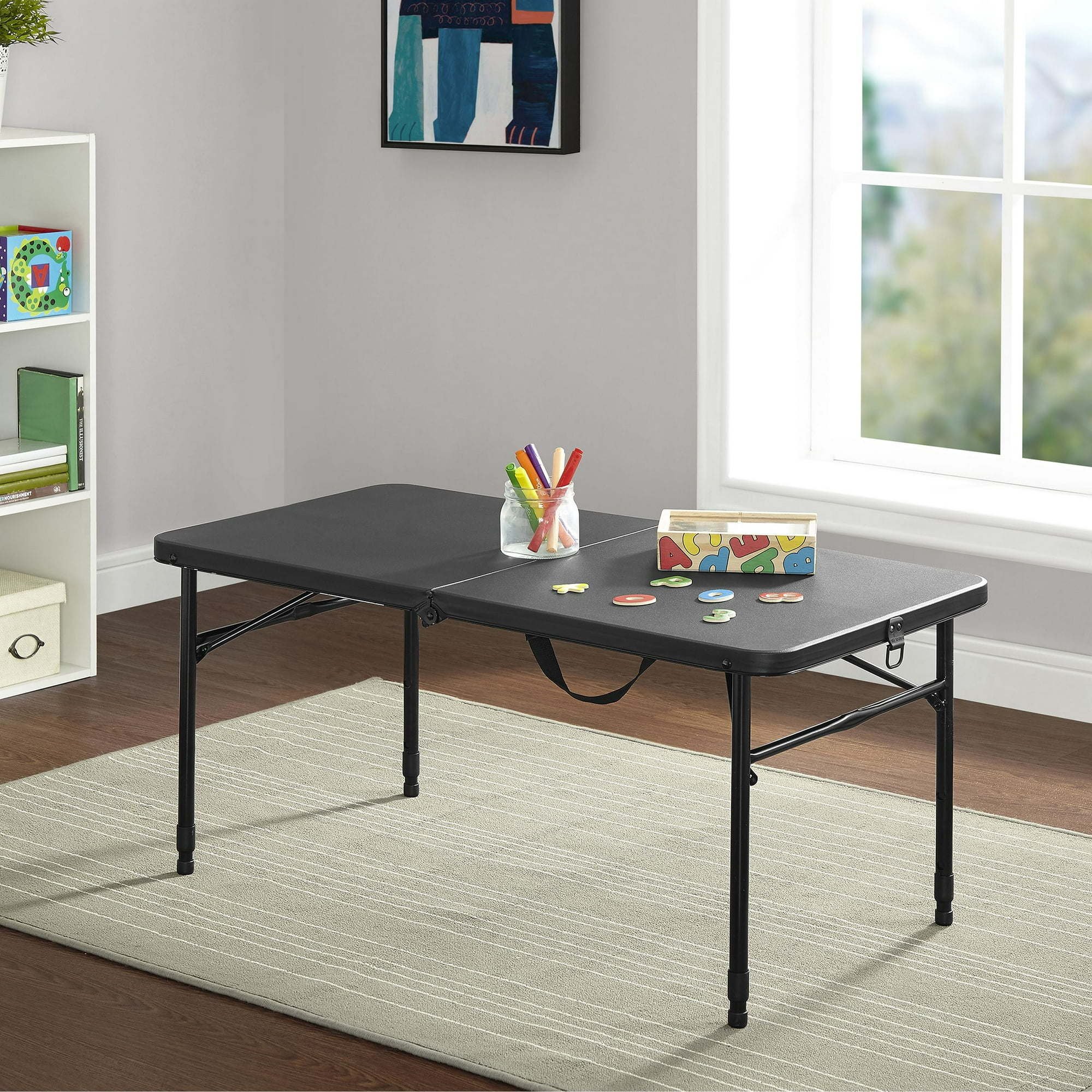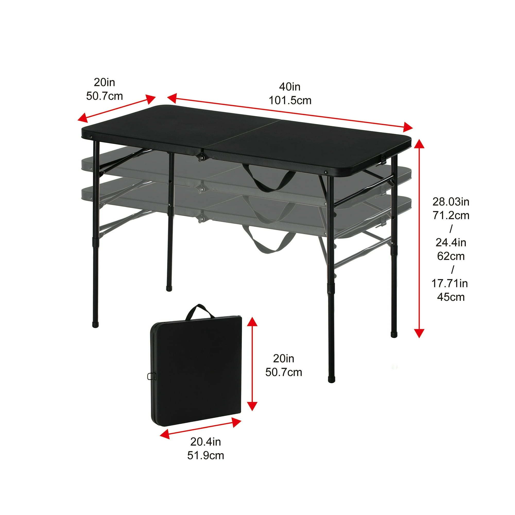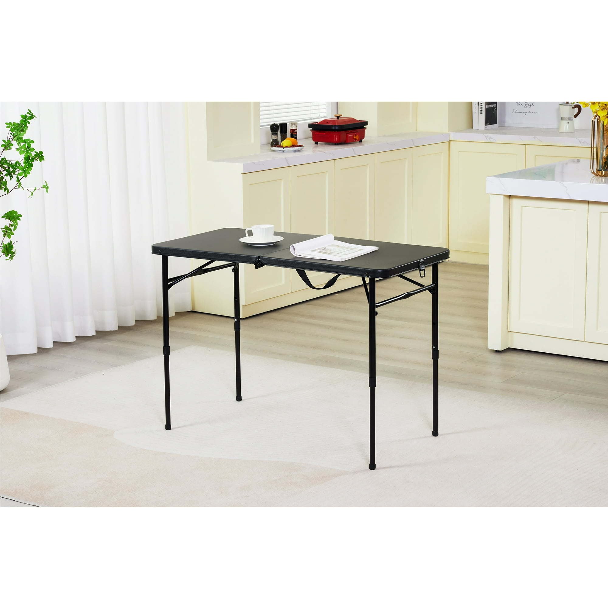 Provide all of the table spaces that you need in all kinds of settings with the 40" Fold-in-Half Table in Rich Black. This versatile rectangular table is sturdy and durable, made with reliable materials, folds for easy storage and transportation, and adjusts to three different heights. When you're finished using it, just fold in the metal legs, fold the table in half, and your new compact table is ready for transport! Its classic black color is sure to fit in at any gathering in any setting, and its spacious expanded 40" long table-top is ideal for holding a wide variety of foods, crafts, or whatever items you are working with! It's great for everyday use both indoor and outdoor, as a serving table, craft supply table, outdoor meal table, or for whatever purposes you may need. The plastic tabletop is easy to clean with no fuss just wipe it down with a damp cloth, and it will look as good as new! The carrying handle makes it perfect for taking on the go, for outdoor barbecues, game nights, school activities, parties, or tailgating events. The tabletop is large enough to be able to sit the whole group down around the table, so all of your friends and family can be included.