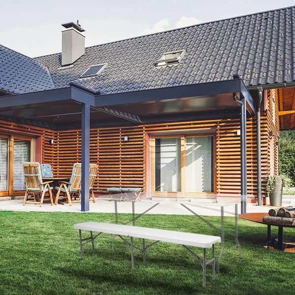 The 6FT Outdoor Courtyard Foldable Bench is perfect for outdoor party, picnic, camping, wedding and more. It is constructed with a polyethylene top and a sturdy tubular steel frame and legs to offer high strength, water resistance, fire retardance and durability. It can be folded and extended easily provide enough space to your guests and save room for storing it under a bed or in a closet. Rubbers on the legs prevent your floor from scratches or any damage. Don't hesitate to order now!