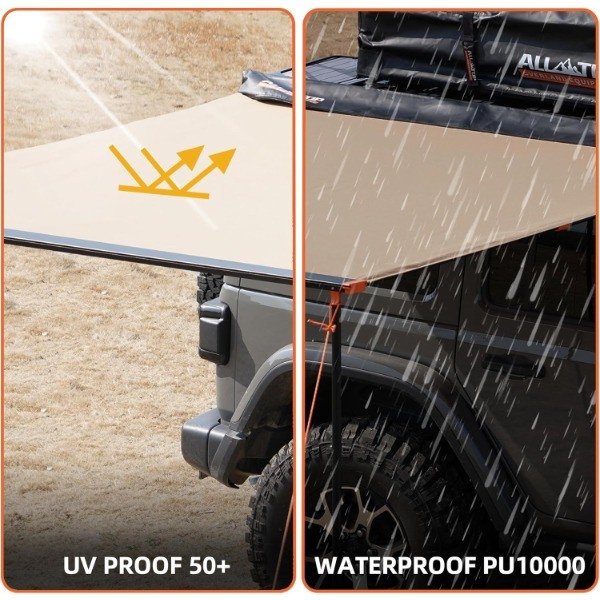 • Overland Must-Have! Made of 280GSM Polyester-Cotton Ripstop Fabric which provides PU 10000 mm Waterproof & UV 50+ Sun Protection for you. The whole Awning system is grouped in a heavy-duty Weatherproof Storage Bag, which is made of 1000D PVC, allowing you to enjoy camping at anywhere and in any weather.