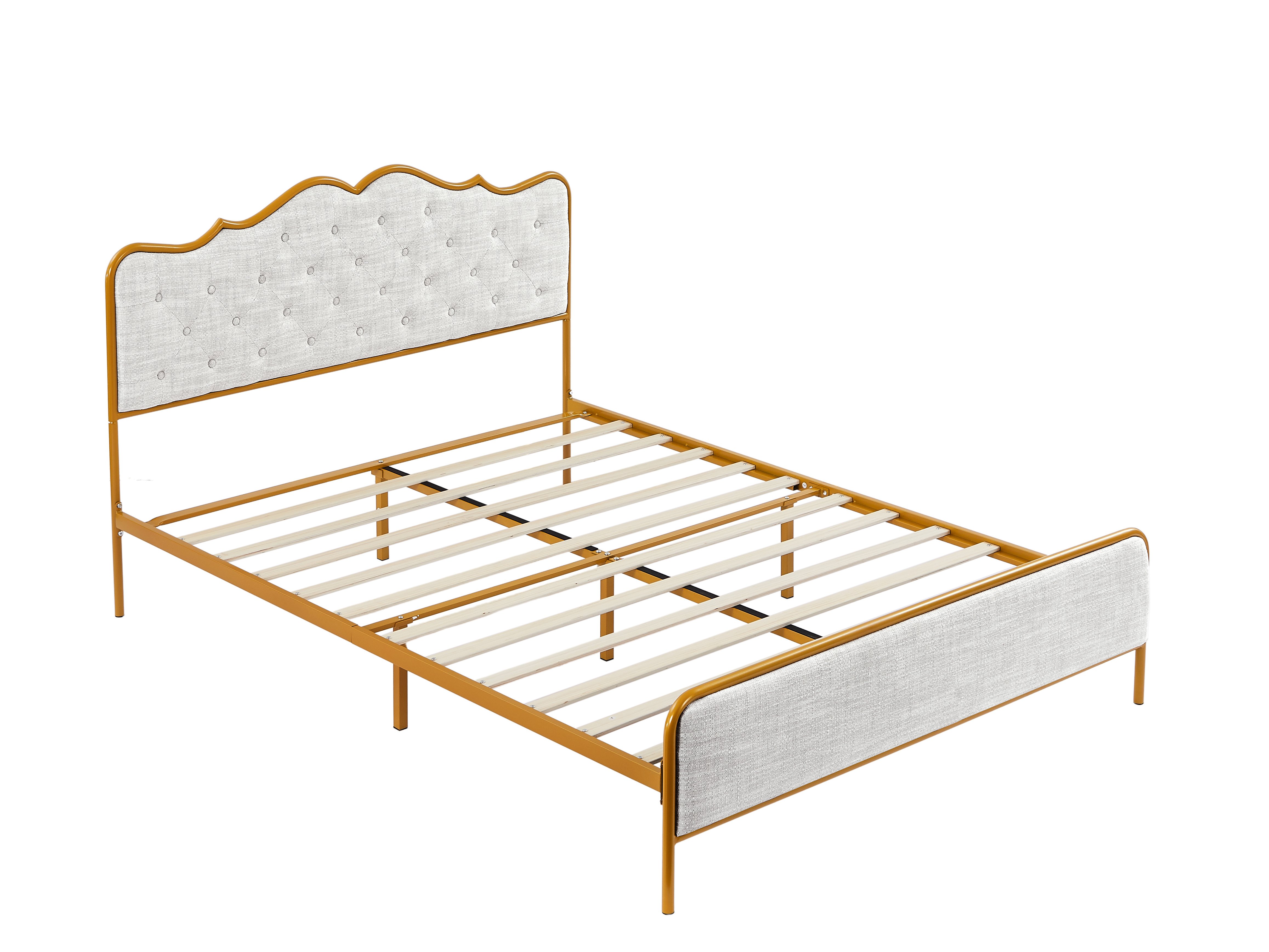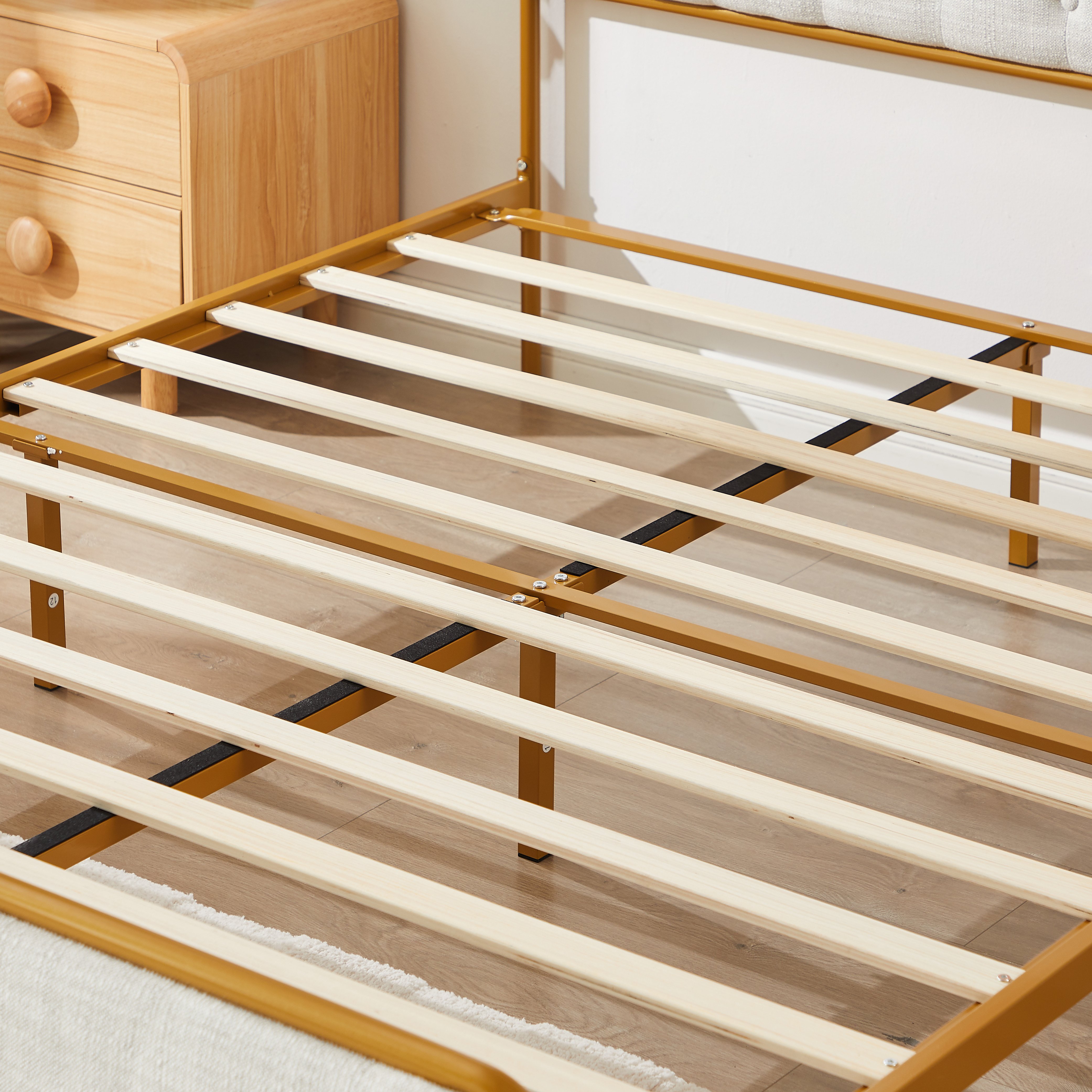 This is a classic pull-button backrest bed. The backrest is made of high-quality soft fabric and filled with high elastic sponge. The overall frame of the bed is made of gilded steel pipe, which is very stable. The ribs of the bed are made of solid wood, which is soft and strong. The whole bed is a dismountable structure.It is connected with screws and various structures through ingenious design, which is stable and durable. It is easy to assemble and carry with less weight.
