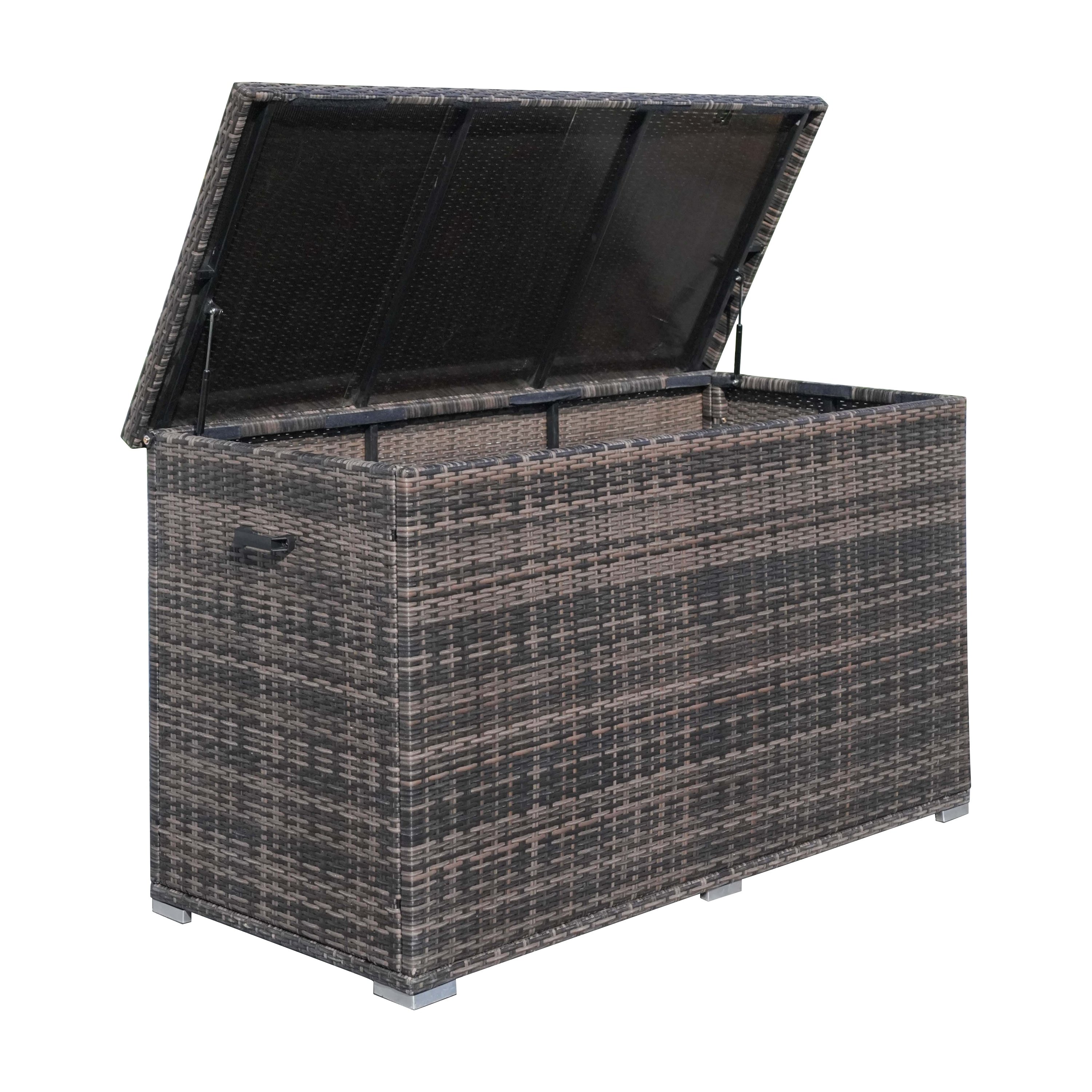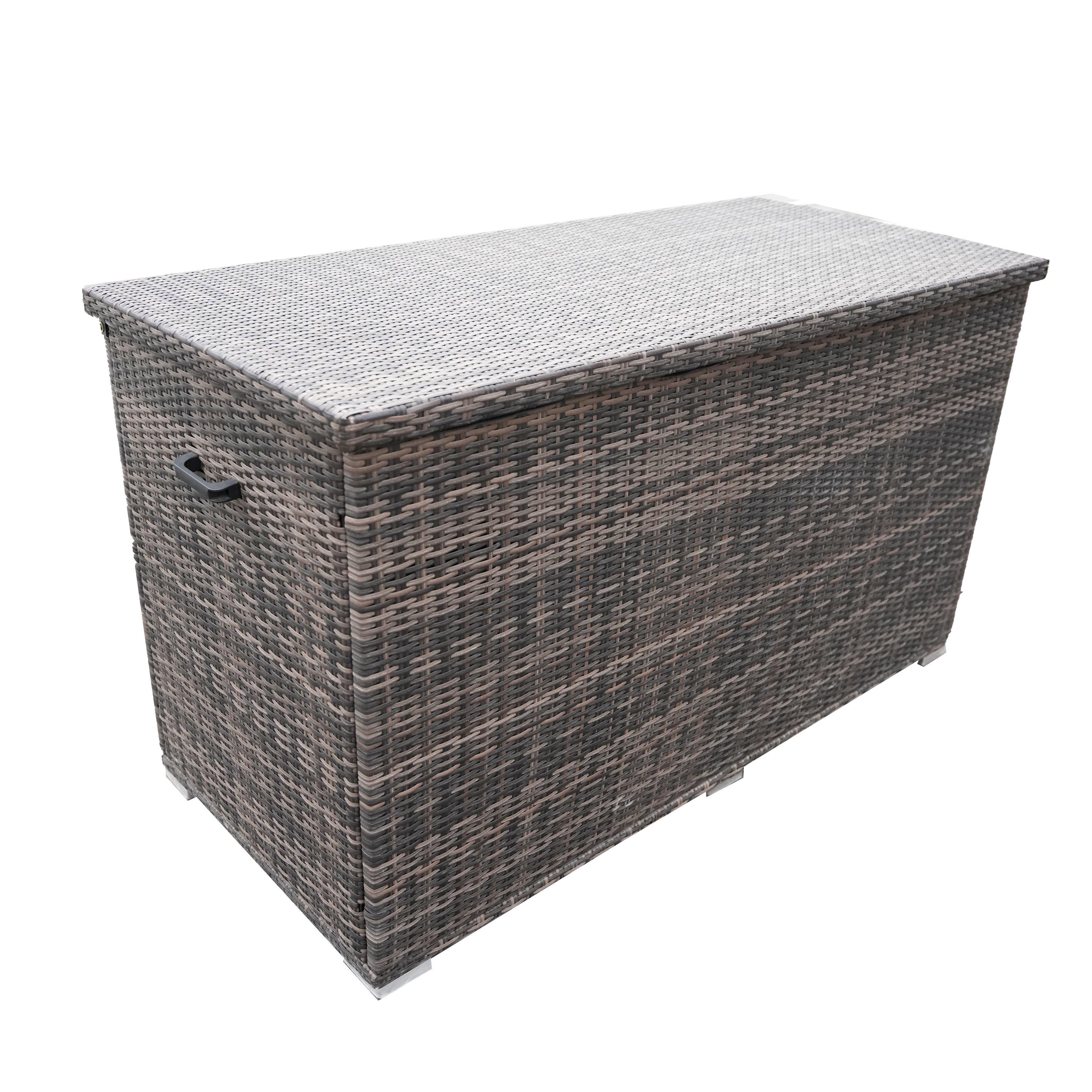This All-weather Brown/Gray Wicker/Rattan Deck Box is designed to keep your cushions clean and dry. The storage box has a top lid that overhangs the sides, this is essential to stop water seeping inside. There is also a zip-up cover on the inside the box for extra protection. The wicker/rattan cushion bin is a decorative and functional addition to your backyard. This storage box has an intricate wicker design, which lends it a captivating appeal. It can store your garden tools, toys, cushions and more. The resin wicker and aluminum frame construction ensure optimal strength and years of durability. This deck box is burnished with a brown finish. It has a hinged top, which provides easy access to your belongings. This wicker/rattan cushion bin is weather-resistant and its finish does not fade with exposure to the U.V rays.