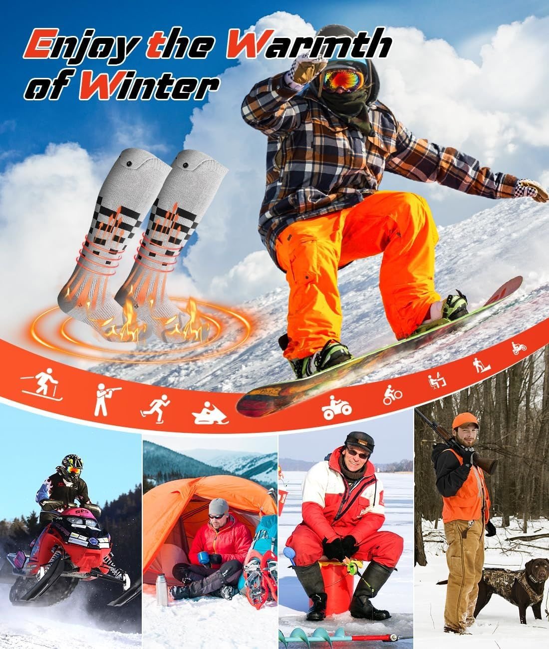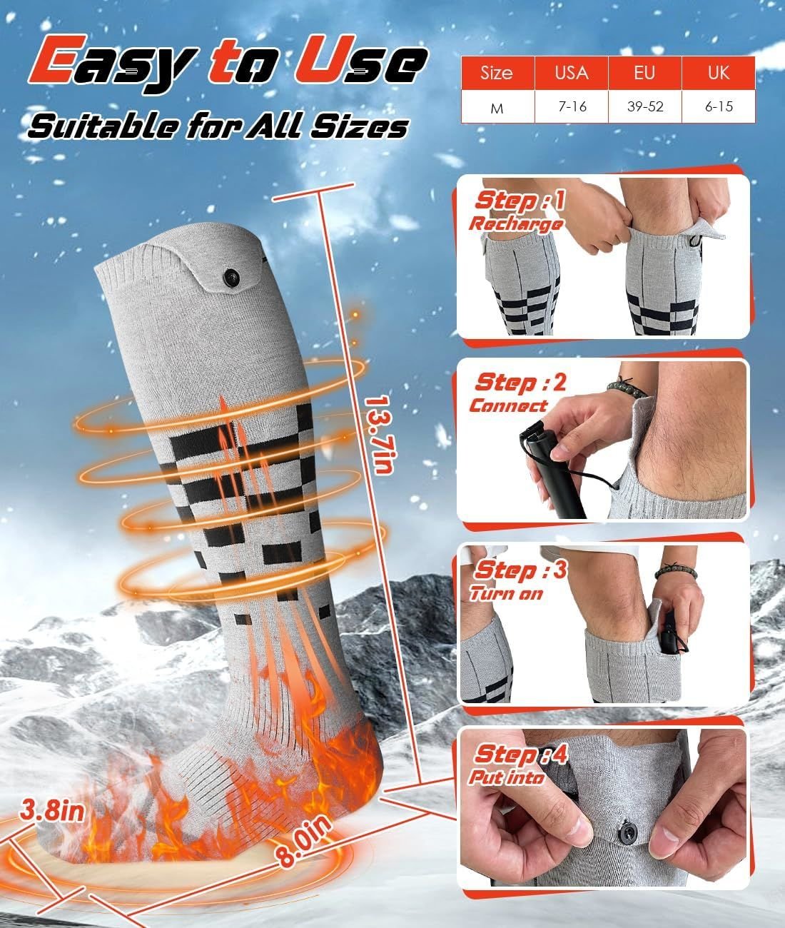 COMFORTABLE AND RELIABLE- Our heated socks are made of high-quality fabric ensuring superior comfort and performance. Breathable material prevents moisture buildup and odor ensuring your feet stay fresh and comfortable. Plush cushioning not only adds warmth but also provides long-lasting wear resistance. The stretchy material provides critical arch support while the knitted construction maintains breathability. Non-slip cuffs ensure your socks stay securely in place during all activities.