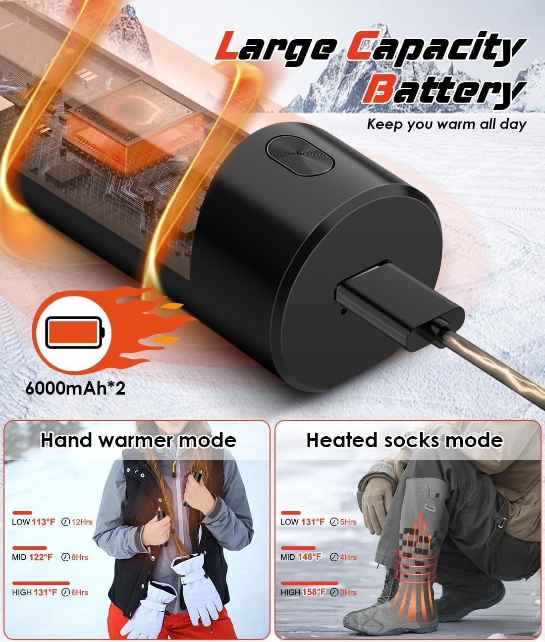 Super Battery Life- The hand warmer we equipped has a built-in 6000mAh battery which provides excellent use time. Hand Warming Mode: You can enjoy continuous warmth for up to 12 hours. Foot Warming Mode: You can enjoy continuous warmth for up to 6 hours. Whether you're on a day hike or a winter camping trip this heated set will keep you warm outdoors.