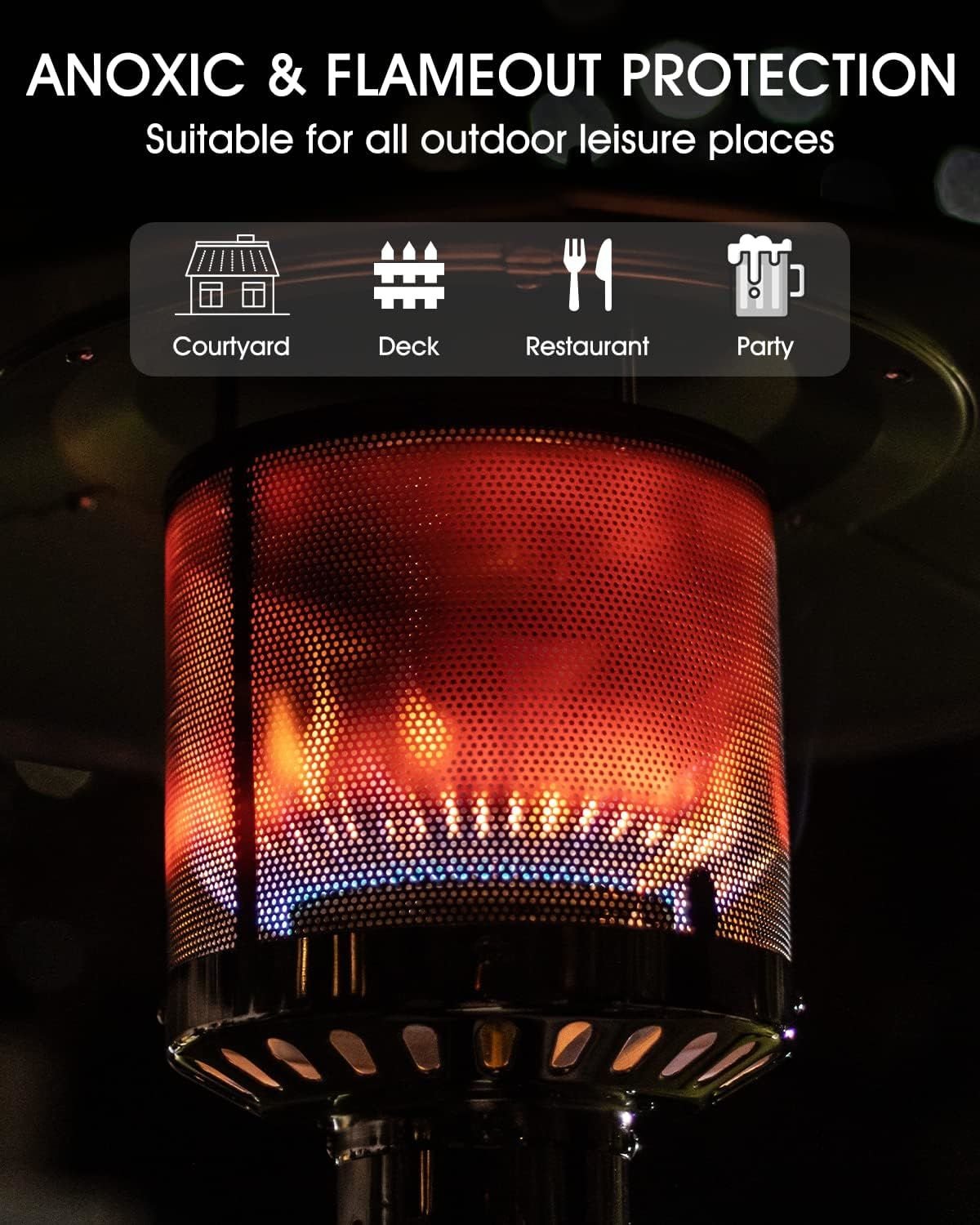 1. Efficient Outdoor Heater: 47,000 BTU output ensures that the heater provides ample heat to keep you cozy on cool evenings and even in colder weather conditions. The domed top aluminum reflector has multiple radiating holes and a hood heating net, pushes the heat downwards while dispersing it outwards.