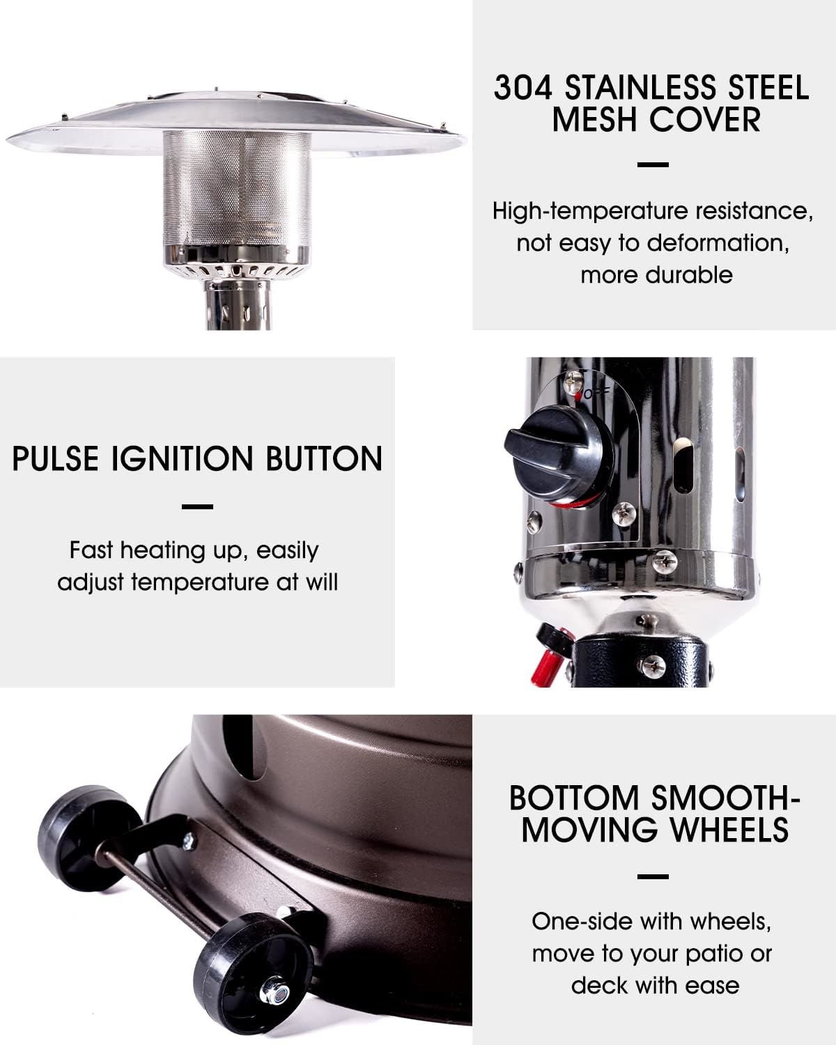 4. Humanization Design: The porch heater comes with 2 flexible wheels, making it effortless to move. Smooth silent wheels can easily move and you can move it to any place by yourself even if you are alone at home. Whether you want to adjust the heat direction or simply store propane heater away when not in use, the wheels make it incredibly convenient.
