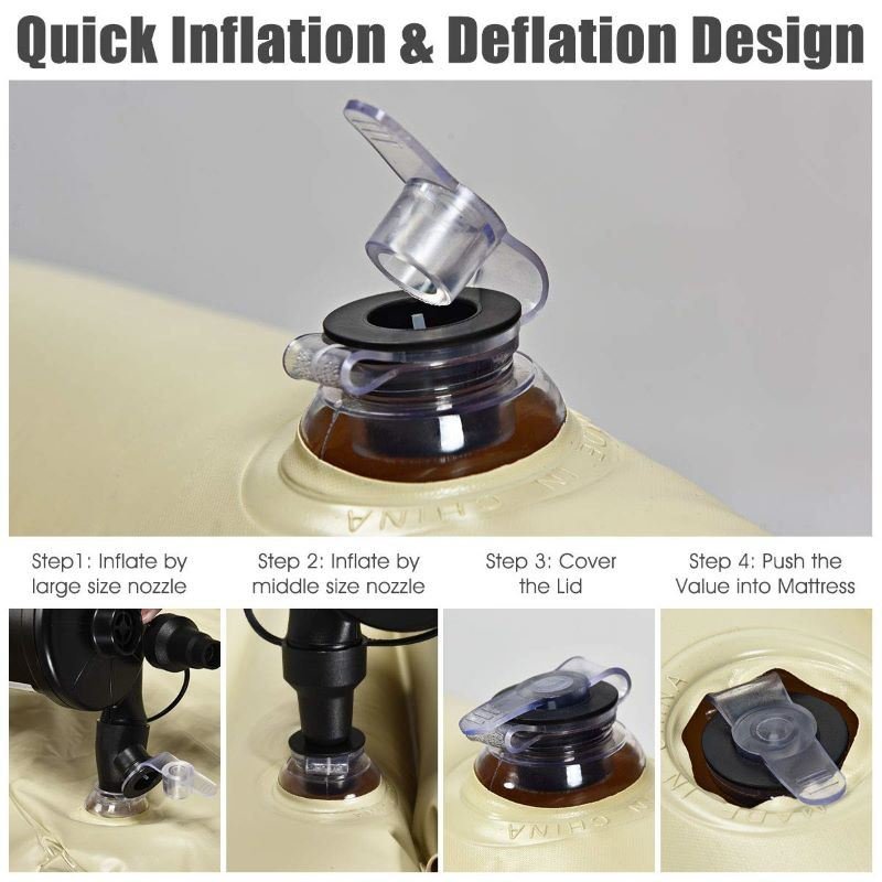 PVC material is durable and wear-resistant for a long lifespan. Foldable and portable air mattress for easily storing and carrying with a carry bag.
