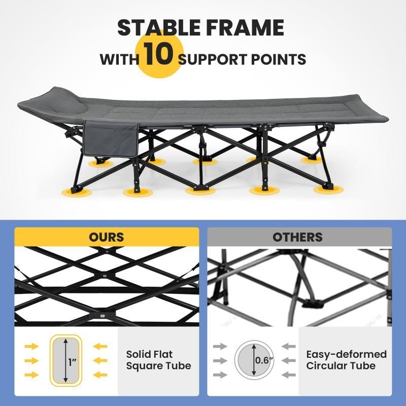 1.The camping cot is designed with a stable metal frame and 10 support legs, ensuring unparalleled stability and eliminating any worries about wobbling or instability.