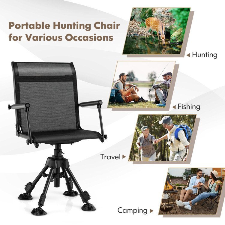 3.Telescopic Legs and Stable Frame: The swivel chair has 8.5" of height adjustment to meet the needs of different situations, allowing you to start the hunt at your best state. In addition, the rotating chair is made of metal structure with a rust-resistant finish that ensures reliable stability and can support up to 330 lbs.