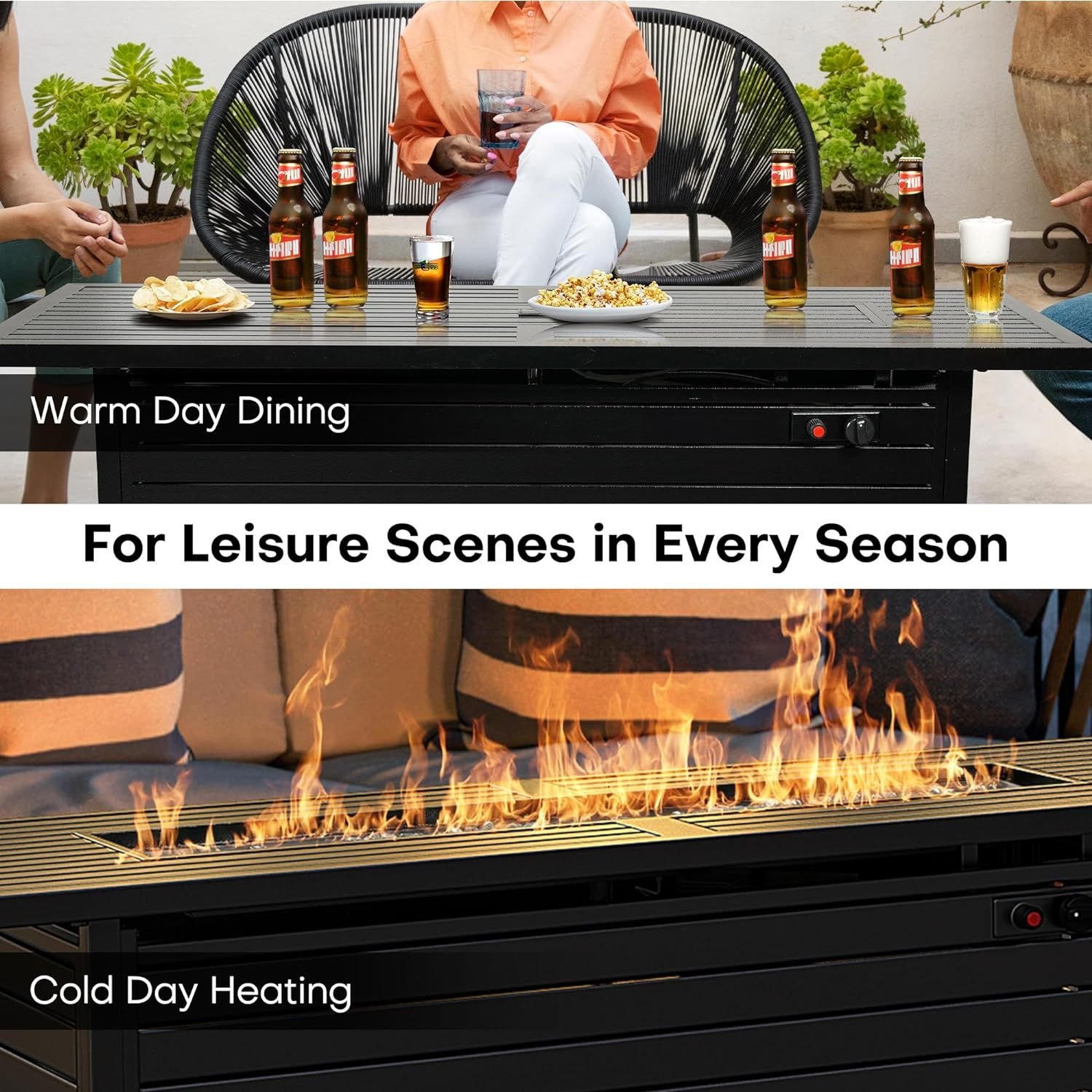 4. 2 in 1 Fire Pit Table: LEGACY HEATING 57" large fire table with burner lid and glass beads allows you to put more drinks and snacks on the top. Or cover the burner and have an attractive table to entertain your guests. The perfect combination of function and form transforms your patio or backyard into a chic lounge.