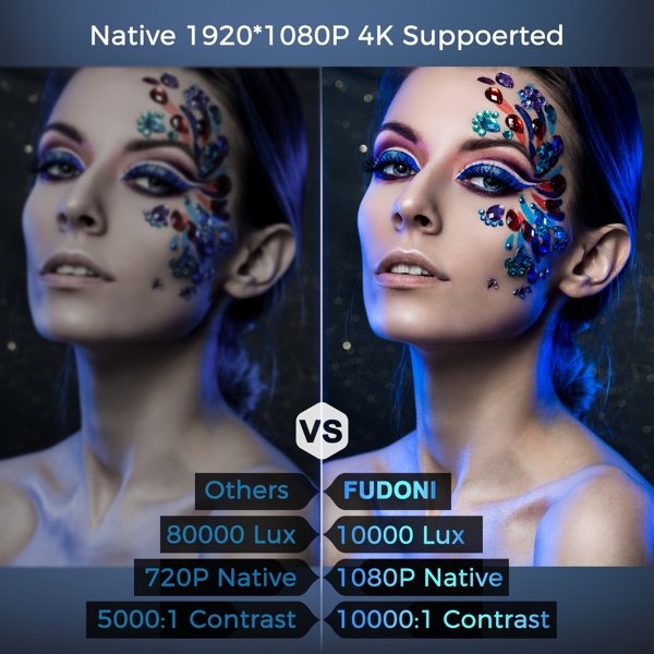 [1080P Full HD Projector]- With native 1920*1080; supported 4k resolution; the home theater projector designed with the latest NTSC color technology to provide superior image quality in terms of brightness; contrast; and color fidelity. 10000 lumens of image quality and an ultra-high 10000:1 contrast ratio allows the projector for more realistic color reproduction and highlights darker details; tiny details can be captured on the big screen; bring you a shocking; immersive viewing experience.
