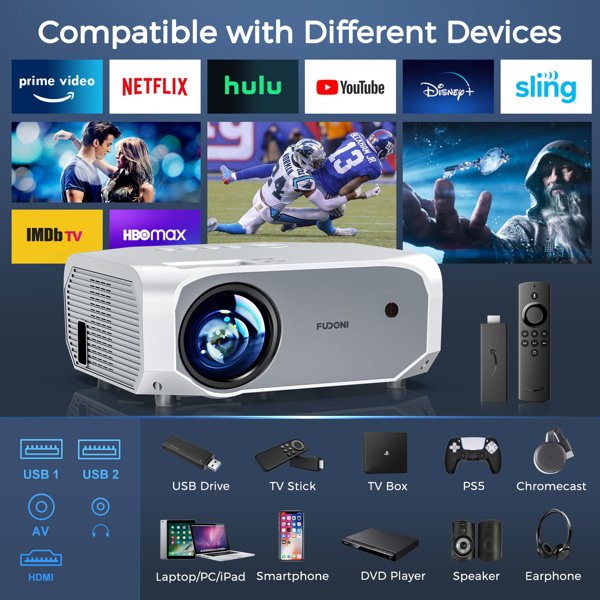 [Compatible with Multi Devices]- The Bluetooth projector provides HDMI/2*USB/AV port/3.5mm audio port; which can connect with TV stick; Smartphone; Laptop; Chromecast; DVD Player; external speakers; PS4; USB flash; etc. Easily meet your movie; match; and game needs.(Due to copyright issues; it can't support watching the videos on Netflix; Prime Video; Hulu; Disney etc while screen mirroring; but it will works well by HDMI connection if you use the TV Stick or Roku Express.)