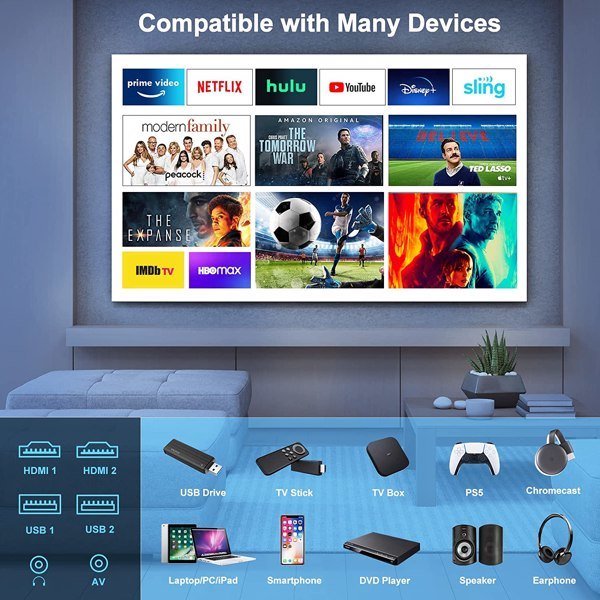 1. Simple HDMI connections provide you with millions of the latest movies and television programs from Amazon Prime Video; Netflix; Hulu and similar streaming softwares. Plug Fire TV Stick; Roku Stick; Apple TV or Google Chromecast into HDMI port; the 4K projector will play streaming software directly.