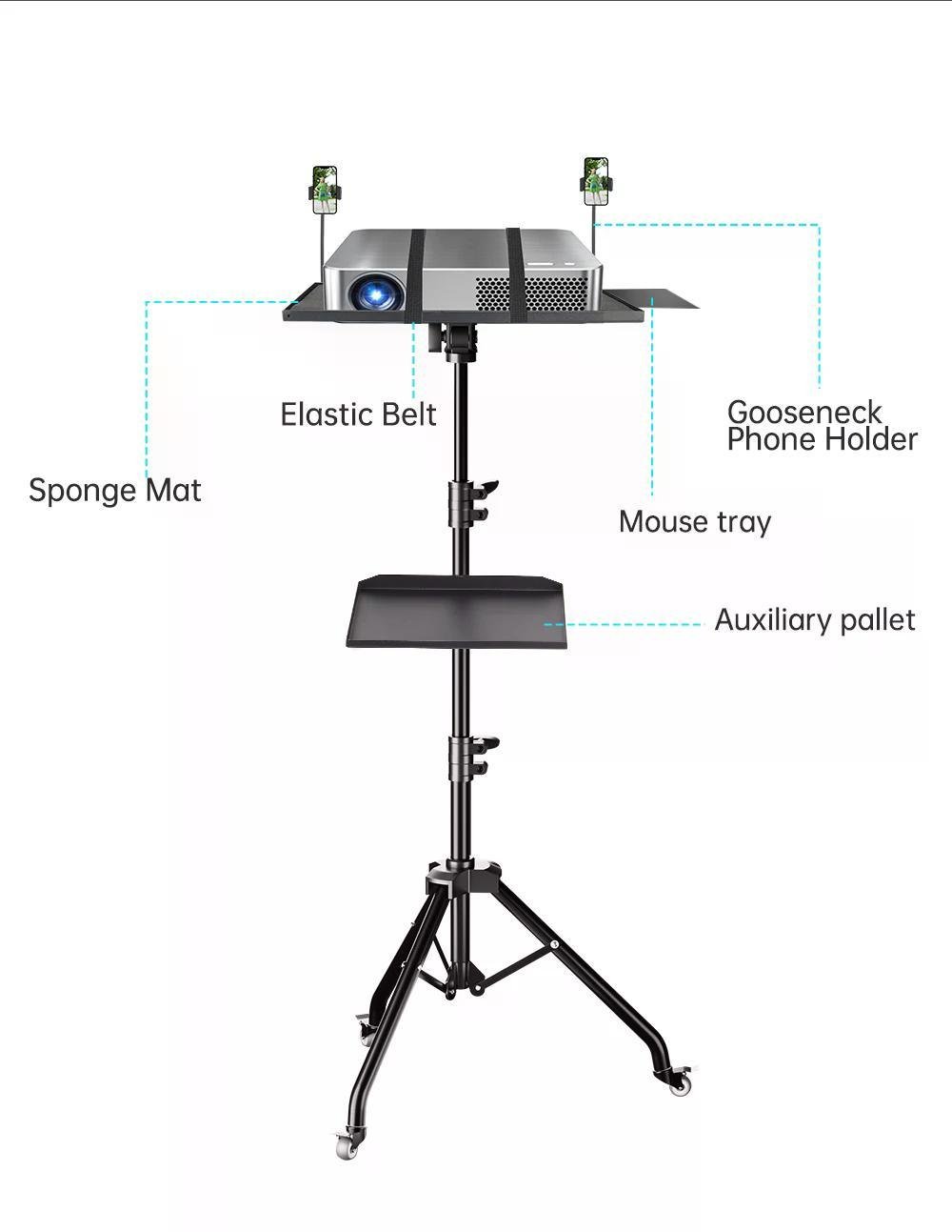 [Durable Construction]: The projector stand is equipped with non-slip pads and shoulder straps to hold the product. The bottom is a thick tripod structure, which provides great stability and ensures complete support of the device. The support openings, non-slip pads and elastic straps of the tray can better ensure the safety of the equipment and prevent the equipment from falling.