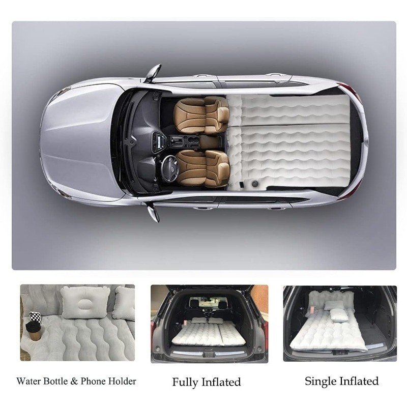 • Canodoky Car Mattress Features: Water bottles and mobile phone holder design, free your hands, three chambers for different sizes of your car, comfort flocking surface, PVC material covered-waterproof, two pillows for nice sleeping, an electric air pump with a three-use gas nozzle, which length is 65", and applicable 90% of inflatable products