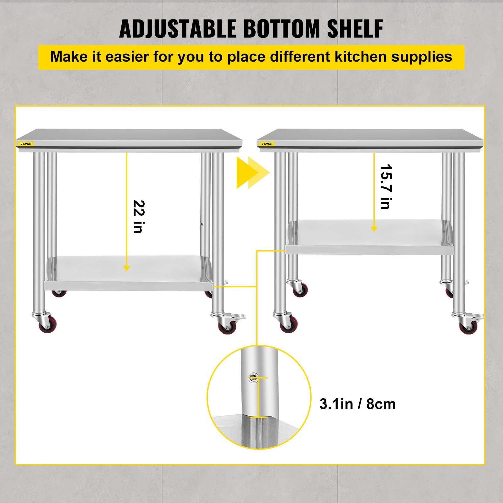 Superior commercial work table. Constructed by durable stainless steel, corrosion, and wear-resistant; It won't deform easily. 36 x 24 x 2.2 in upper table size and 29.9 x 18.1 x 1.6 in undershelf provide ample storage space. 4 caster wheels provide flexibility. You can easily change the height of the undershelf—perfect using in the kitchen, restaurant, school, or other domestic or commercial applications.