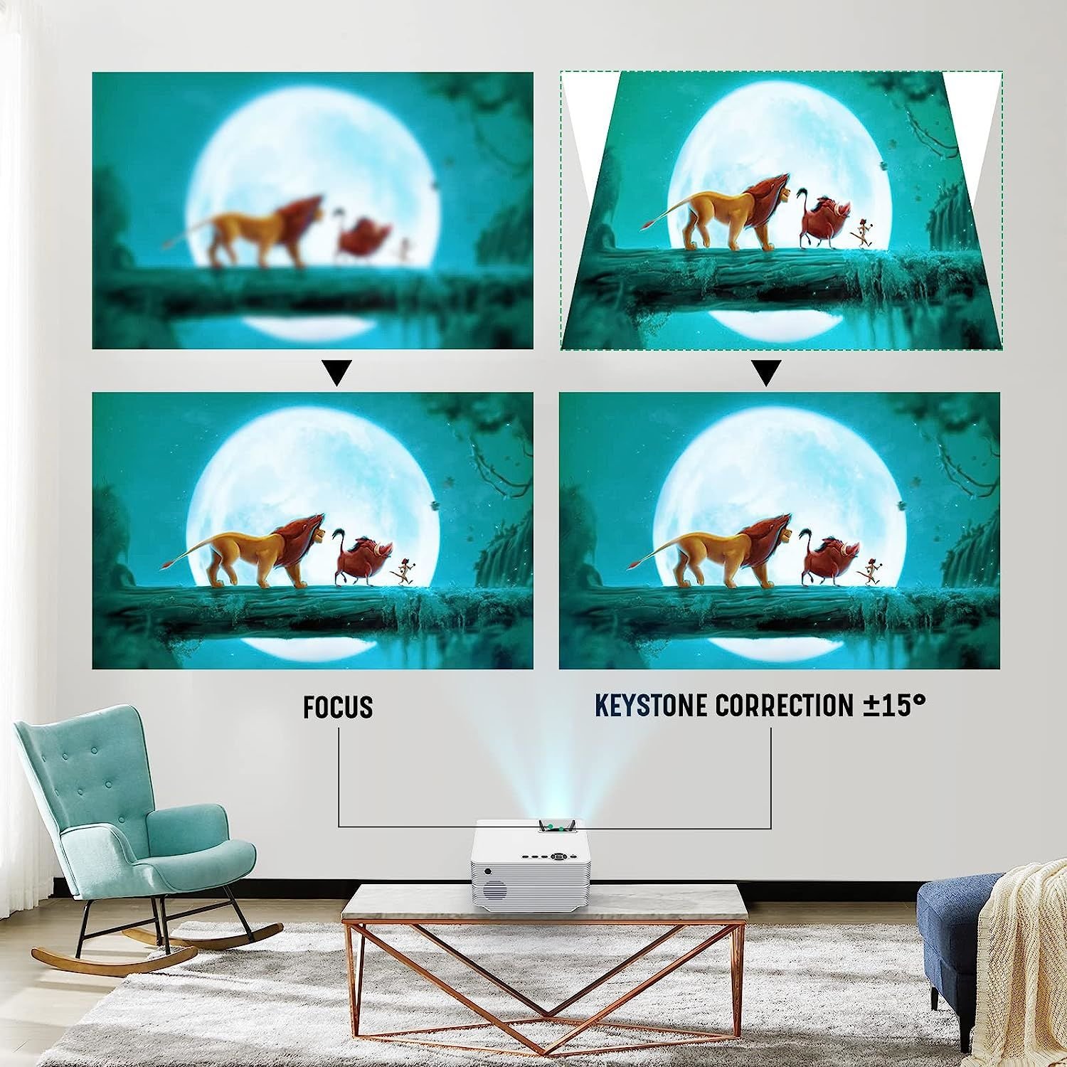 4.350’’ Giant Display & 75% Zoom Function:Offering the projection distance from 40’’ to 350’’ (3.3 ft-29ft ), this portable 1080p projector makes you enjoy super large-screen movies just like in a movie theater. With zoom function, you can adjust the image size from 100% to 75% using the remote without moving the projector. Built in 2*HDMI/2*USB/AV/Audio ports, this 1080p smartphone projector can be easily connected to TV Stick, PC, laptops, USB Flash Drives, speakers, iOS, Android, PS5 etc