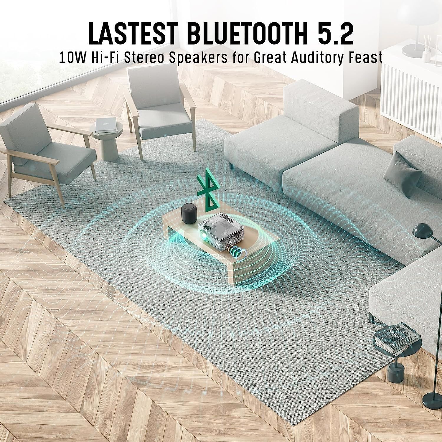 3.10W Hi-Fi Stereo Speakers & Low-noise Fan & Night Mode:Built-in 10W dual stereo speakers, you can enjoy great stereo surround sound. With advanced cooling fan, this can reduce noise 20% of WiFi Bluetooth smart projector compared to similar phone projectors, and also help to extend the life of your native 1080P HD projector. Set High Power mode to Low Power mode to reduce brightness and fan noise, allowing you to enjoy movies more impressively at night while protecting your eyes